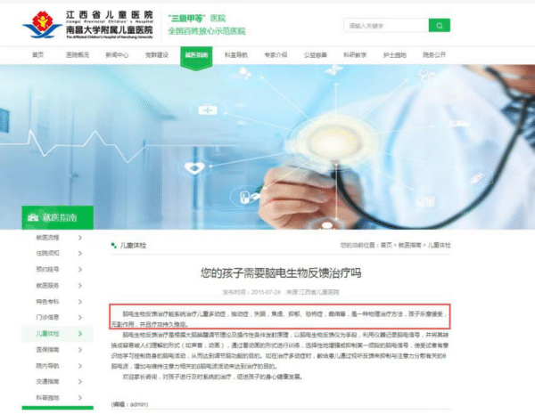 在江西省兒童醫(yī)院官網(wǎng)里面就有提到這項(xiàng)綠色健康的訓(xùn)練方法,大腦生物反饋對(duì)兒童多動(dòng)癥等發(fā)育行為障礙具有輔助治療作用。