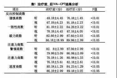 治療前后IVA-CPT結(jié)果分析:反應(yīng)控制商數(shù)方面:謹(jǐn)慎商數(shù)(視聽(tīng))、一致性商數(shù)(視聽(tīng))有顯著性差異 (P<0.01),毅力商數(shù)有差異(P<0.05);注意力商數(shù)方面:警惕商數(shù) (視聽(tīng))、注意力集中商數(shù) (視聽(tīng))有顯著性差異(P<0.01),速度商數(shù)(視聽(tīng))有差異(P<0.05),見(jiàn)表1。